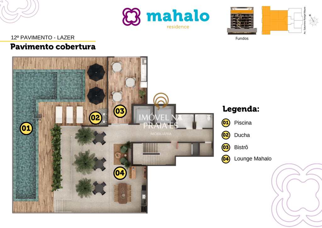 O Lazer é Completo e entregue Montado e Decorado, com o grande destaque para a Piscina na Cobertura com raia de 15m e vista para o mar, além do Lounge Mahalo (Espaço Gourmet), Bistrô com churrasqueira, Salão de Festa climatizado, Espaço Kids e Espaço Fitness.